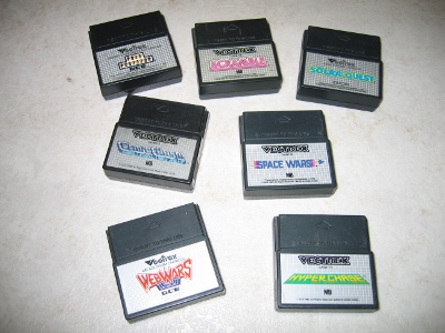 Abgesehen vom eingebauten Spiel Mine Storm (mehr zu diesem Spiel später) erschienen die Spiele alle auf Modulen (4K oder teilweise 8K Module) welche auf der rechten Seite der Konsole eingesteckt werden. Es gibt ca. 25 bis 30 offizielle Vectrexspiele.