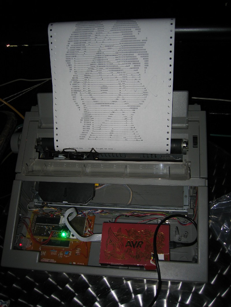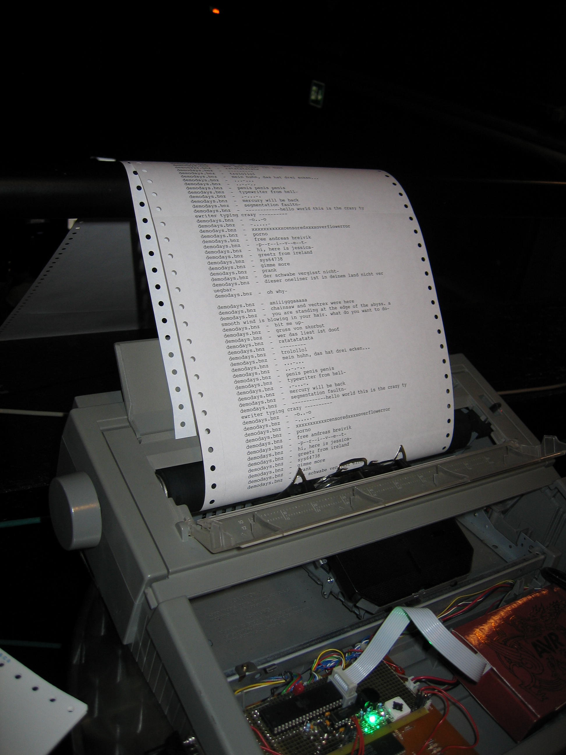 | The interactive demo from Compiler and Freelancer. The typewriter with a microcontroller was printing online all onelinertexts entered on the partywebsite, but also oneliners written on pouet.net and other scenesites. (Click to enlarge the pictures.) And later the machine was used to print some ASCII art ;-) |